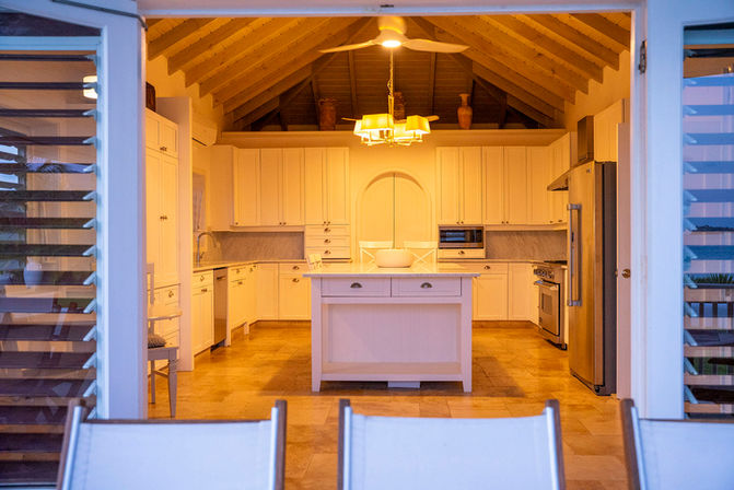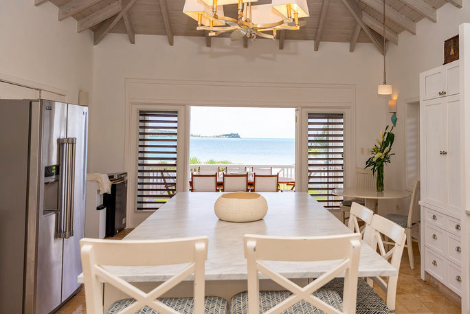 The villa unfolds in a series of thoughtfully connected spaces. The entrance pavilion houses two guest suites and a comfortable lounge, setting the tone for relaxed island living. From here, an open-air courtyard with a pergola roof forms the heart of the residence, with two additional guest suites positioned on either side. Beyond, the main building extends to a spacious living and dining area with vaulted ceilings and retractable doors, a well-appointed kitchen, and the master suite, all flowing directly onto the pool deck and beach beyond. Premium finishes such as travertine and large-format tiles establish a timeless aesthetic, while all bedrooms are air-conditioned and complemented by ceiling fans for year-round comfort.